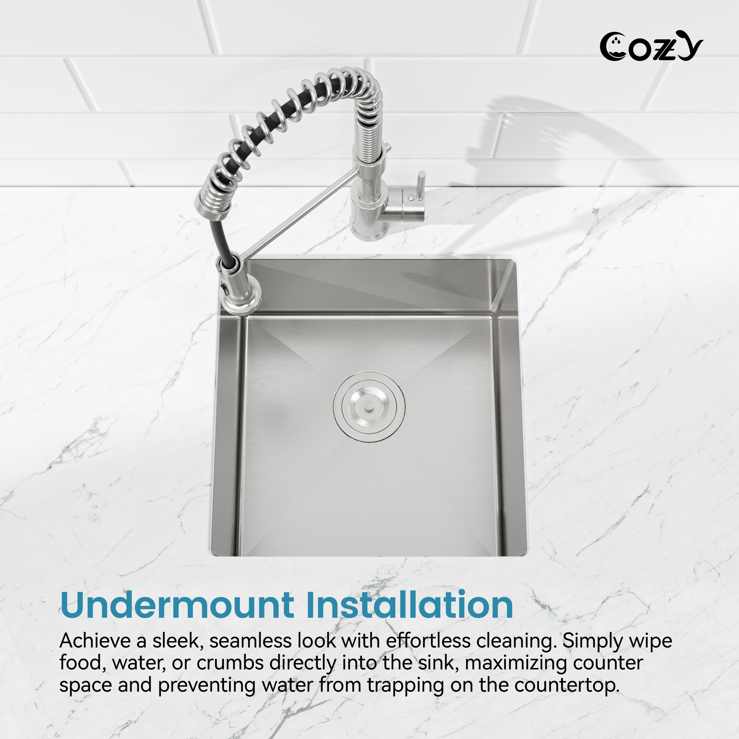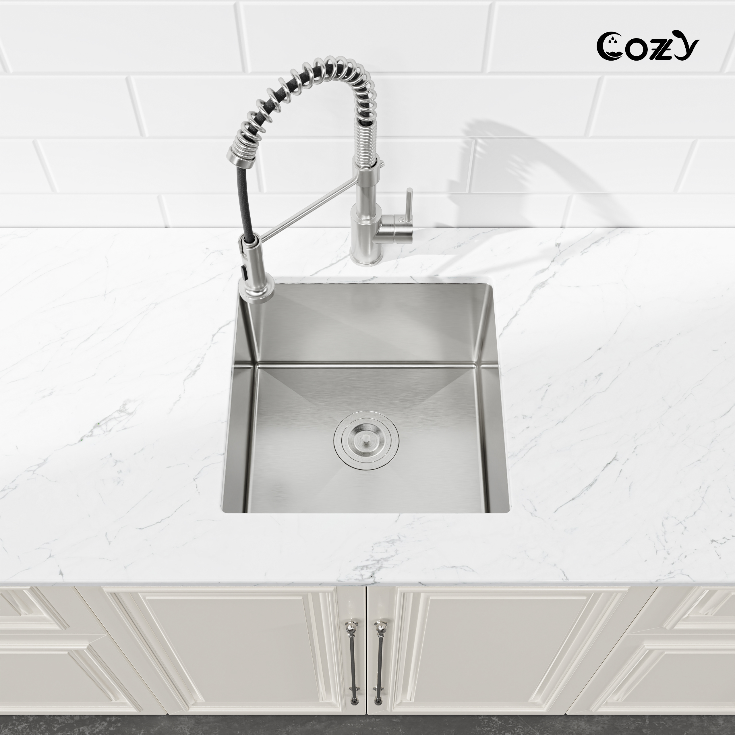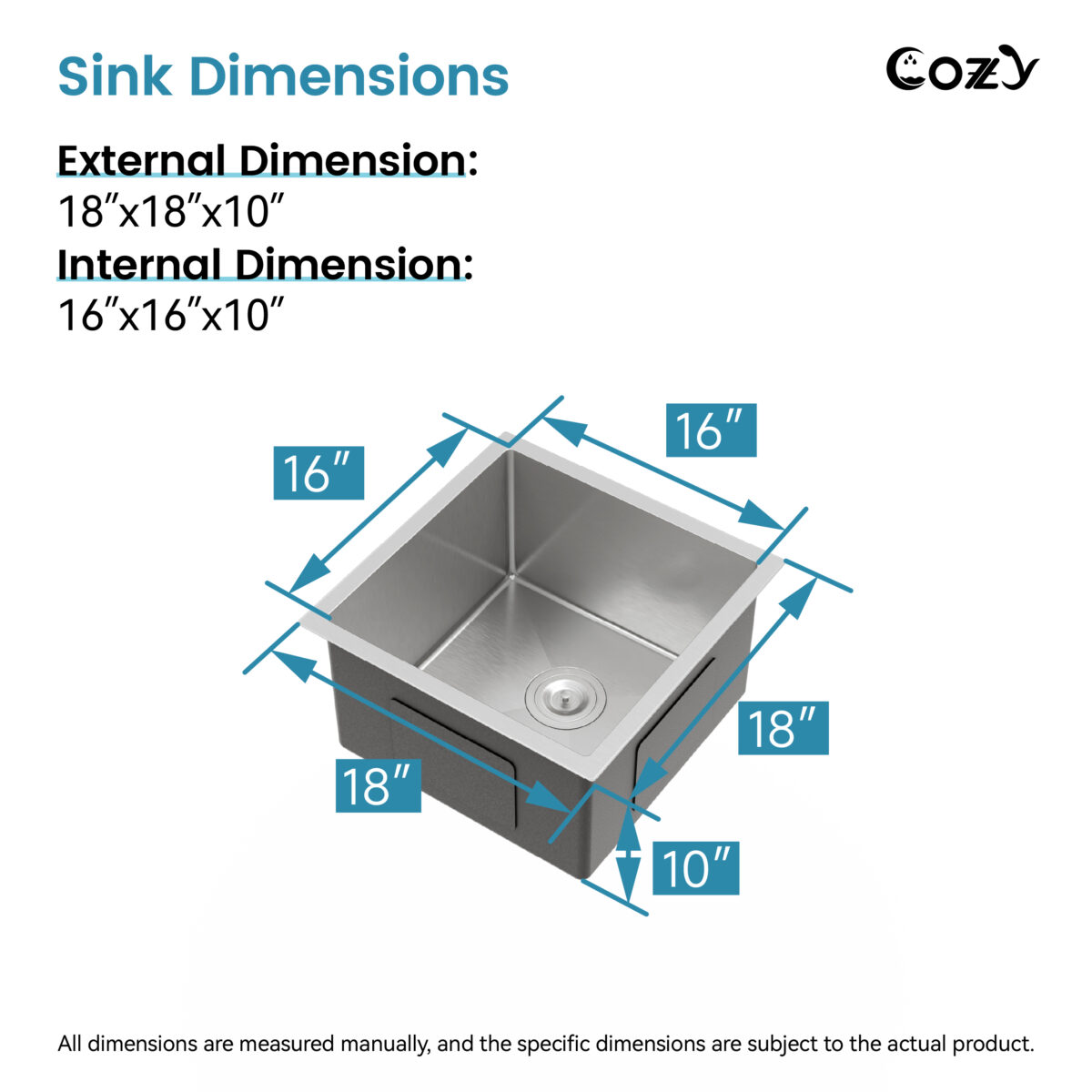 18″x18″ Stainless Steel Kitchen Sink, Single Bowl, Undermount Handmade Sink in Brushed Nickel, with US Standard Drain and Hook, LS-SSBR07