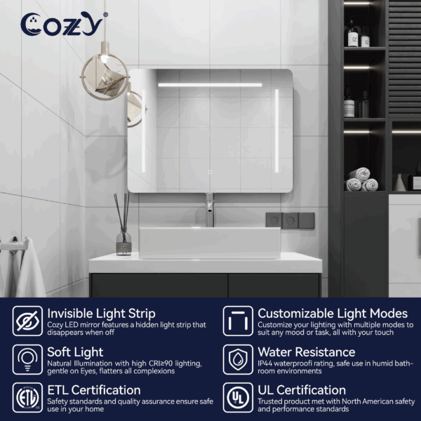 Touch Sensors & Memory: Lighted touch buttons make operation a breeze, and intelligent memory functions will remember your preferred lighting settings, even after turning the mirror off and on.