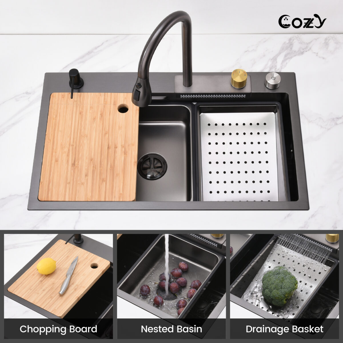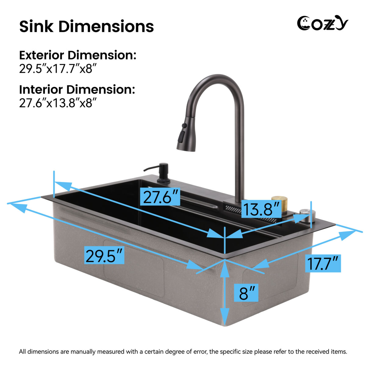 29.5″×17.7″ Stainless Steel Single Bowl Sink,Waterfall Kitchen Sink, Stainless Steel Single Bowl in Black, Multifunctional Workstation with Flying-rain Faucet and Cutting Board, SS-BL05-301808