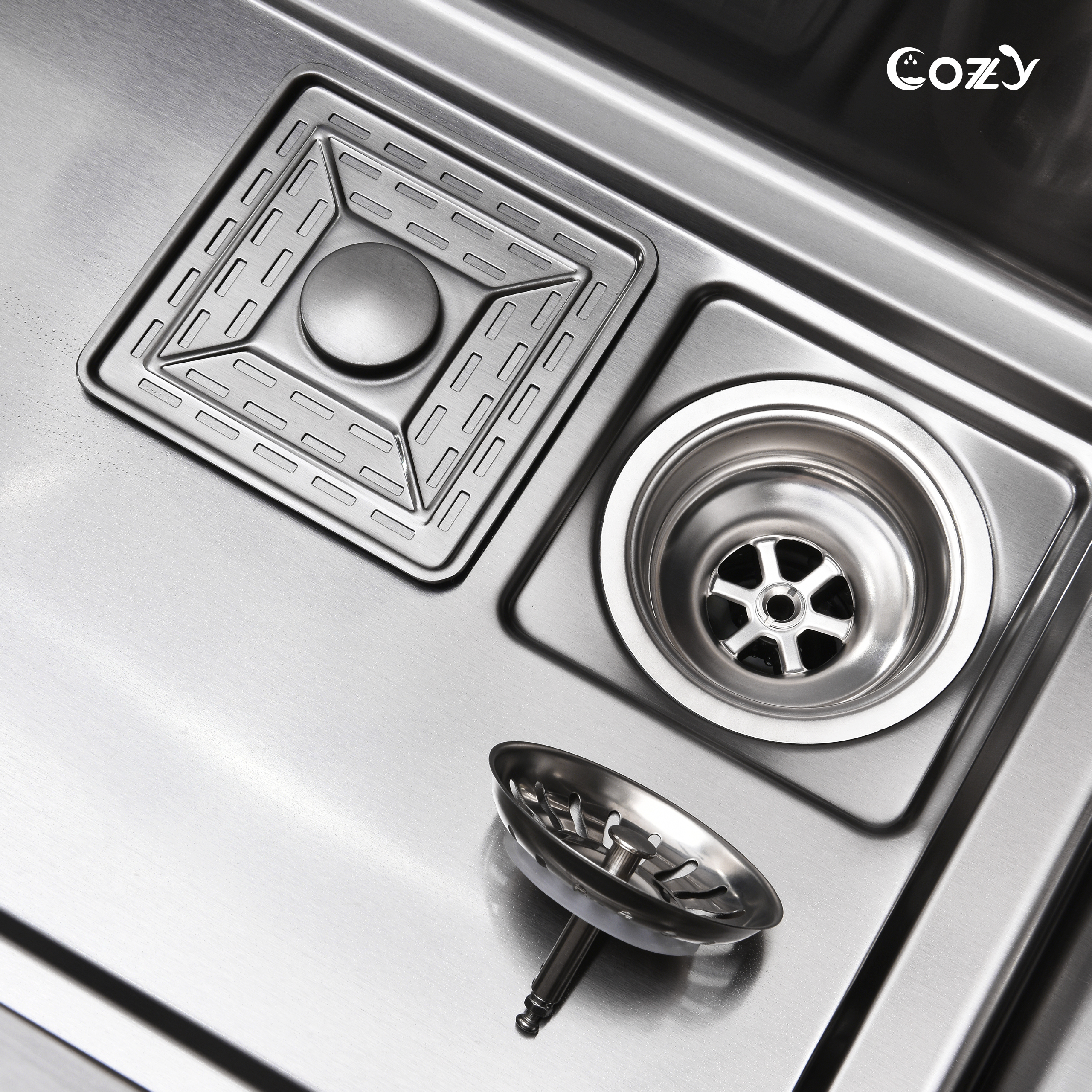 - This sink includes a versatile space for washing, cutting, and draining. The set comes with a cutting board, basin-in-basin, triangular drainage basket, and drainer, maximizing workspace and enhancing functionality.