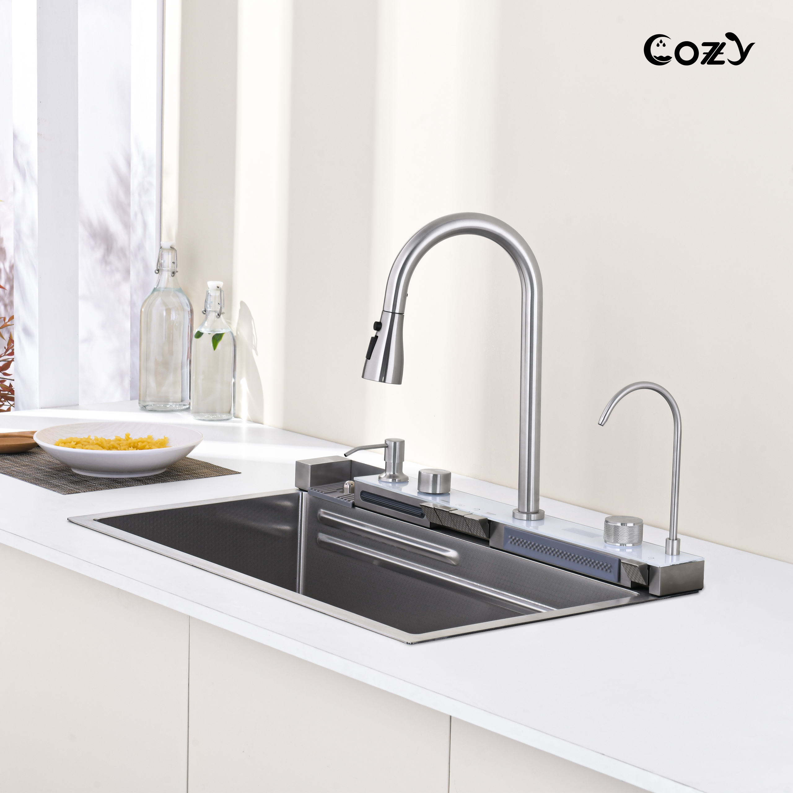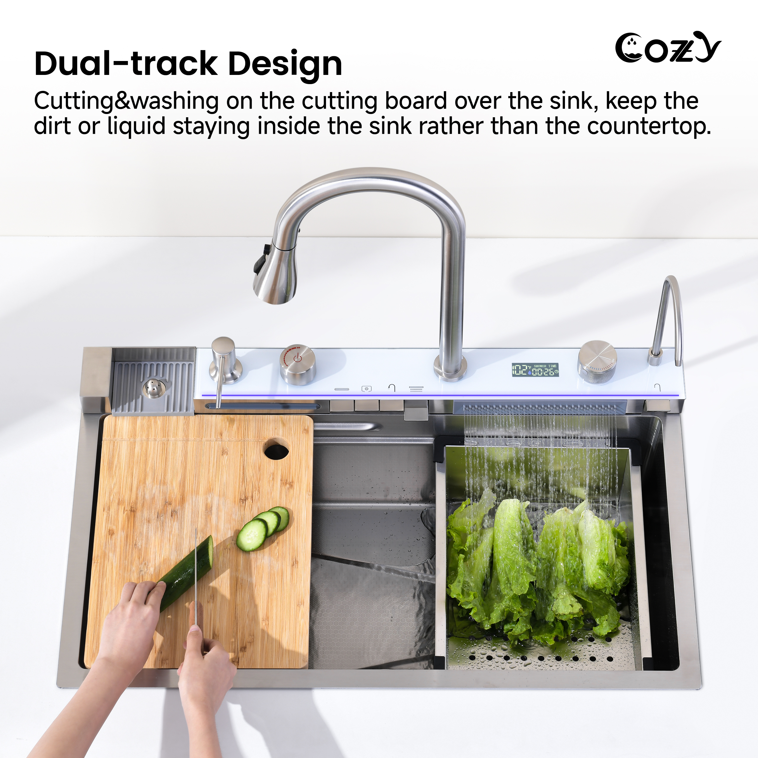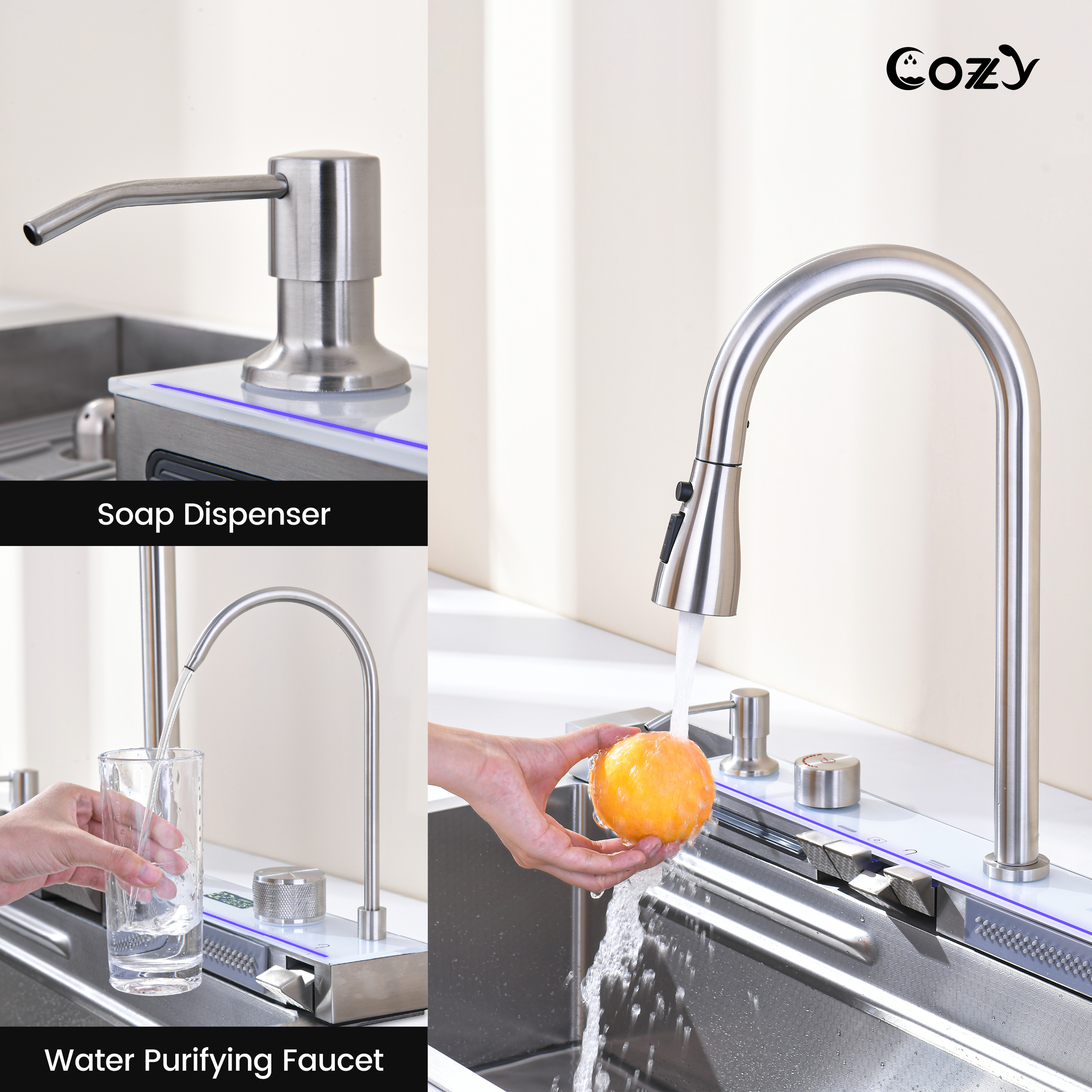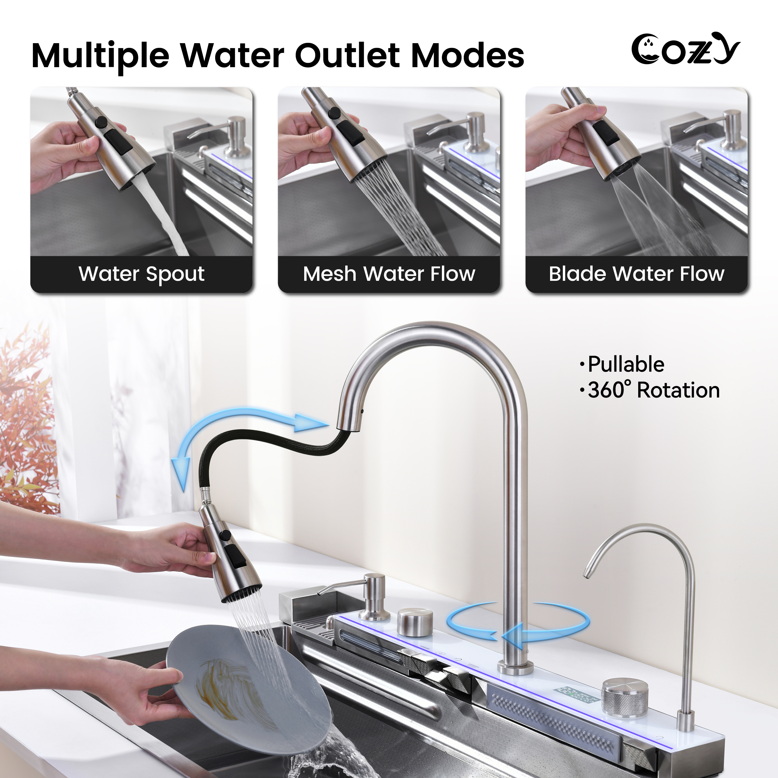 This Brushed Nickel smart kitchen sink features a digital screen that shows water temperature and usage time in real time. Simple piano-style buttons let you control the waterfall outlet, cup washer, pull-out faucet, and rain-style water flow. The faucet runs on water power—no batteries needed—making it safe and energy-saving. The pull-out faucet has three water modes: regular stream, wide mesh flow, and strong blade spray for deep cleaning. Dual knobs make it easy to control water temperature, pressure, and drainage. The honeycomb coating resists water, oil, and scratches. Slide the cutting board, basin, and drain basket to save space. It also connects directly to standard garbage disposals. Includes faucet, purifier, basin, cutting board, cup washer, and more. Great for kitchens, bars, and balconies. Contact us for any missing parts or questions—we’re here to help.