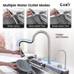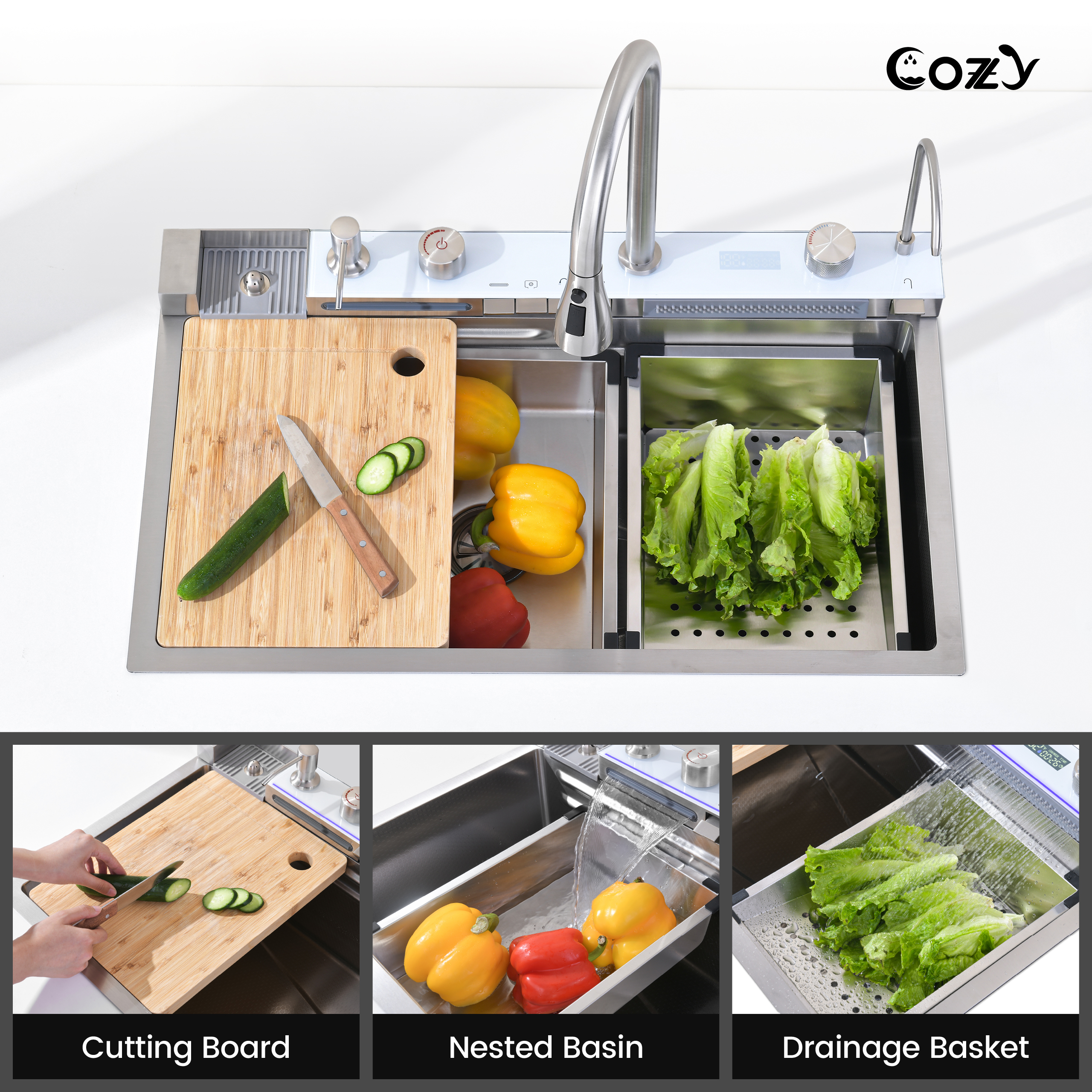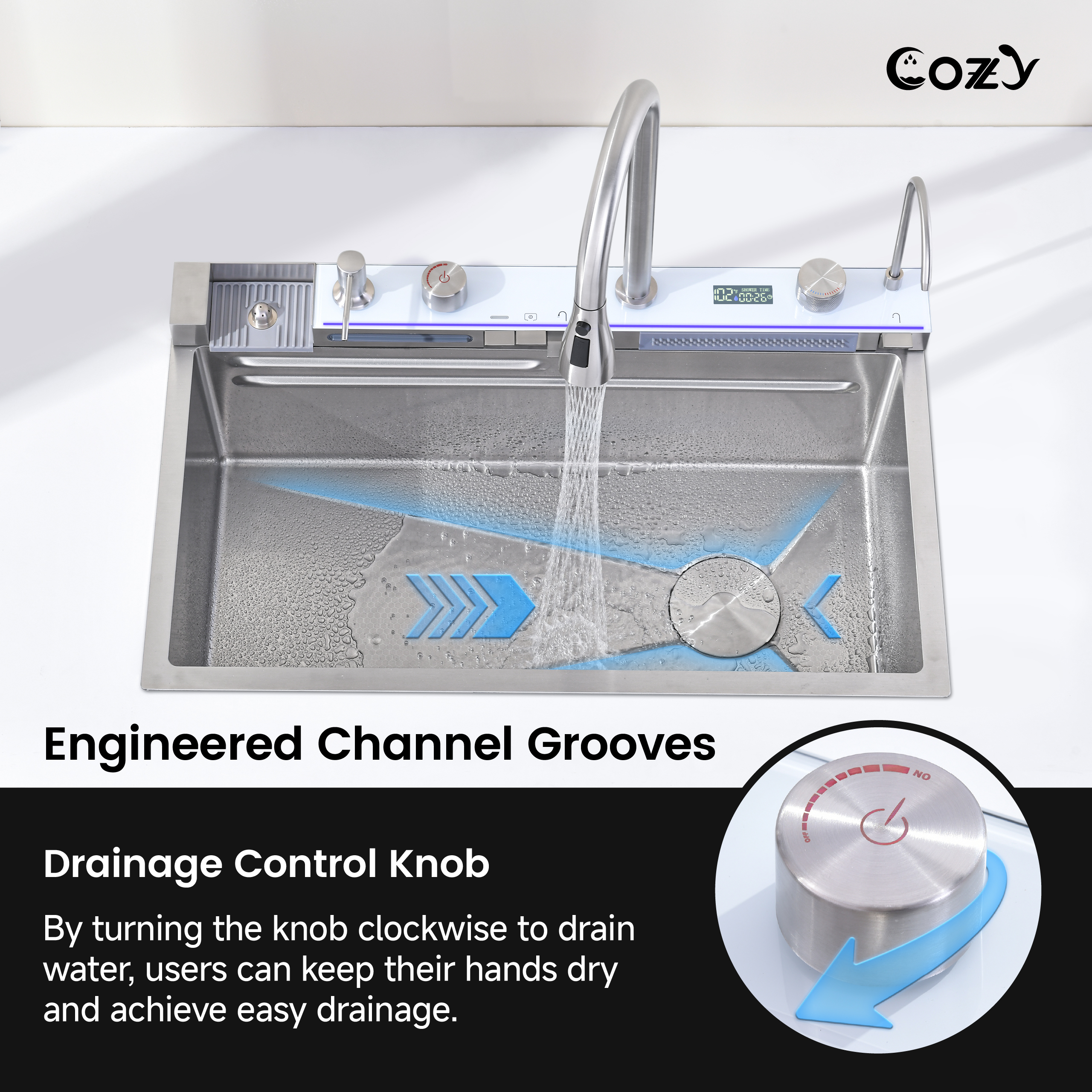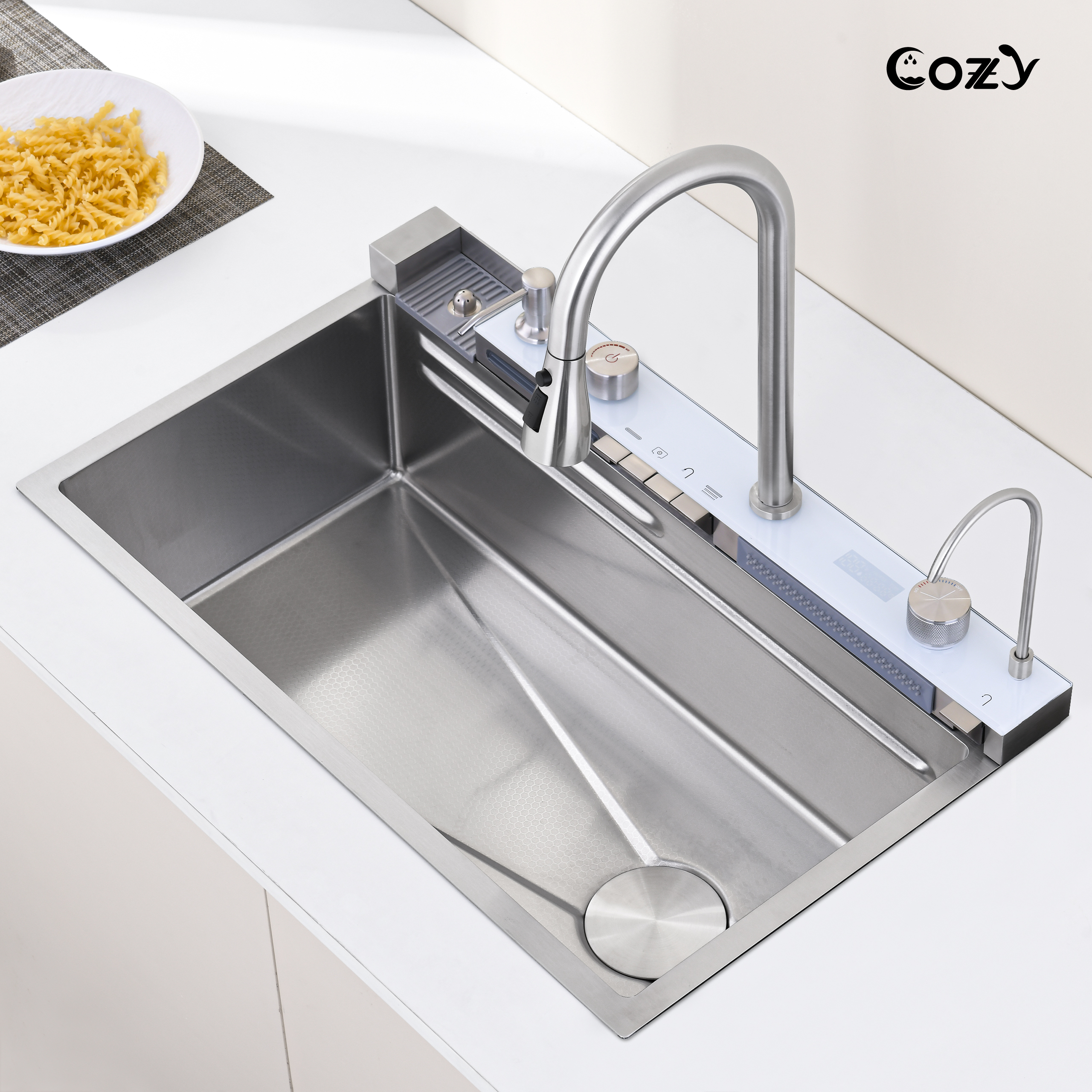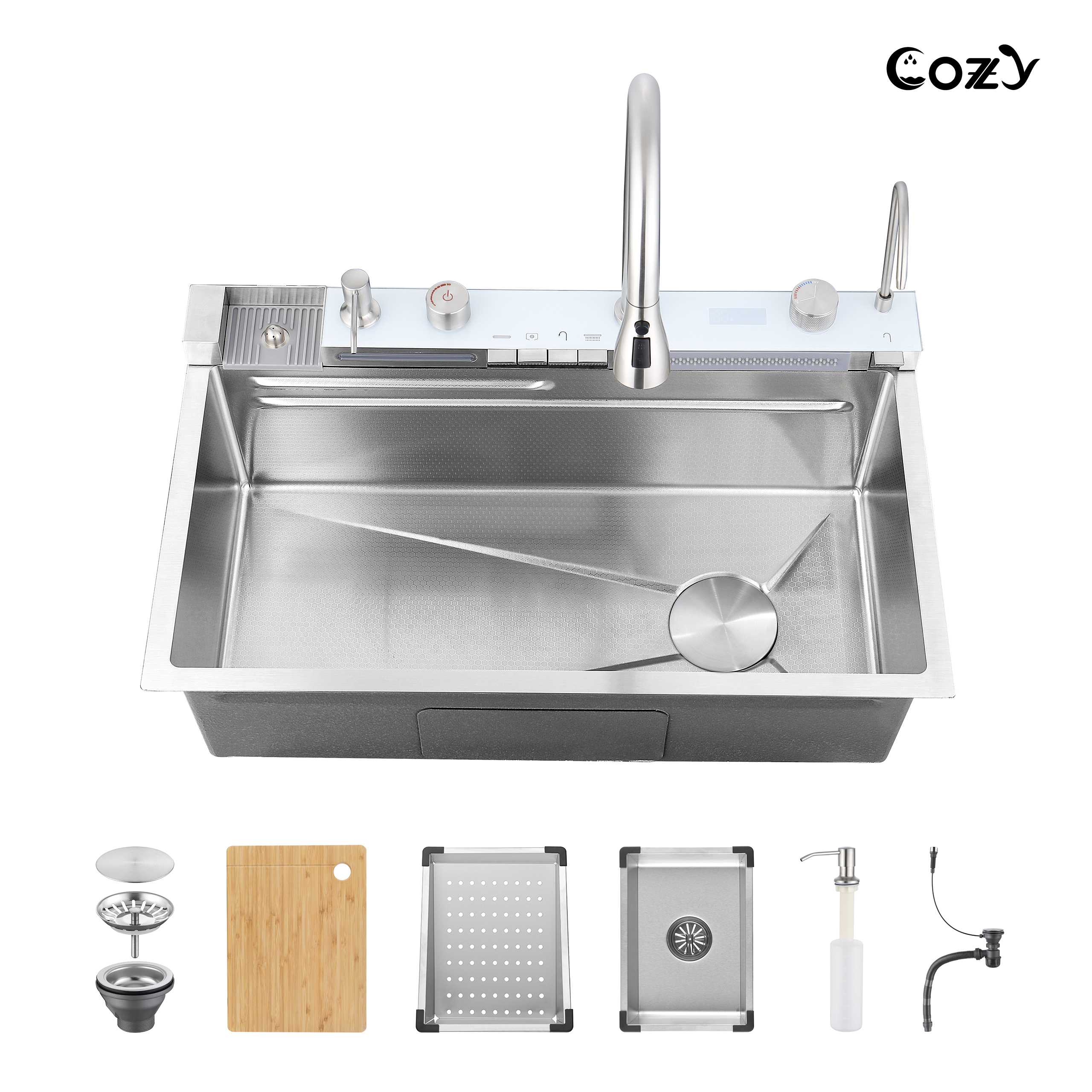 This Brushed Nickel smart kitchen sink features a digital screen that shows water temperature and usage time in real time. Simple piano-style buttons let you control the waterfall outlet, cup washer, pull-out faucet, and rain-style water flow. The faucet runs on water power—no batteries needed—making it safe and energy-saving. The pull-out faucet has three water modes: regular stream, wide mesh flow, and strong blade spray for deep cleaning. Dual knobs make it easy to control water temperature, pressure, and drainage. The honeycomb coating resists water, oil, and scratches. Slide the cutting board, basin, and drain basket to save space. It also connects directly to standard garbage disposals. Includes faucet, purifier, basin, cutting board, cup washer, and more. Great for kitchens, bars, and balconies. Contact us for any missing parts or questions—we’re here to help.