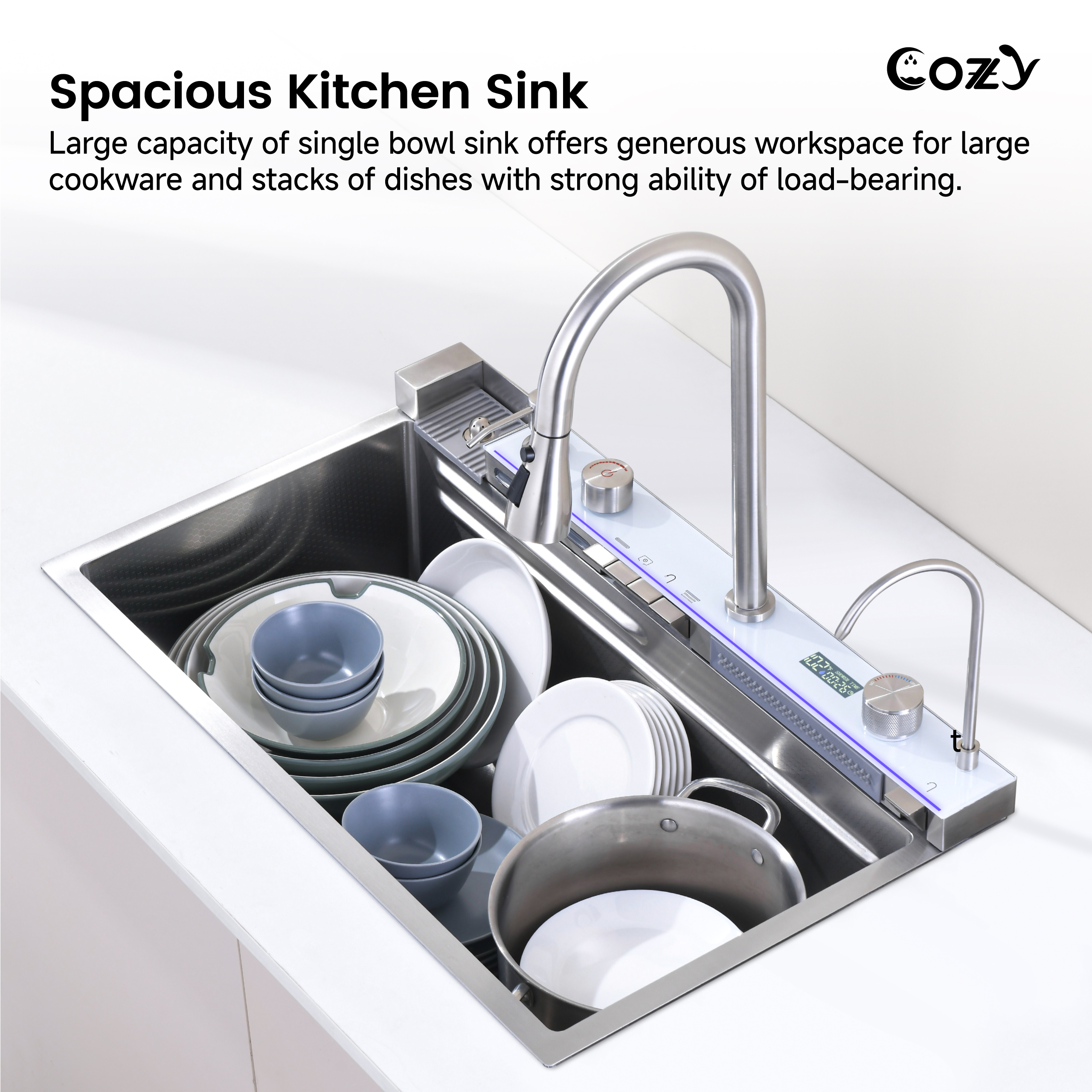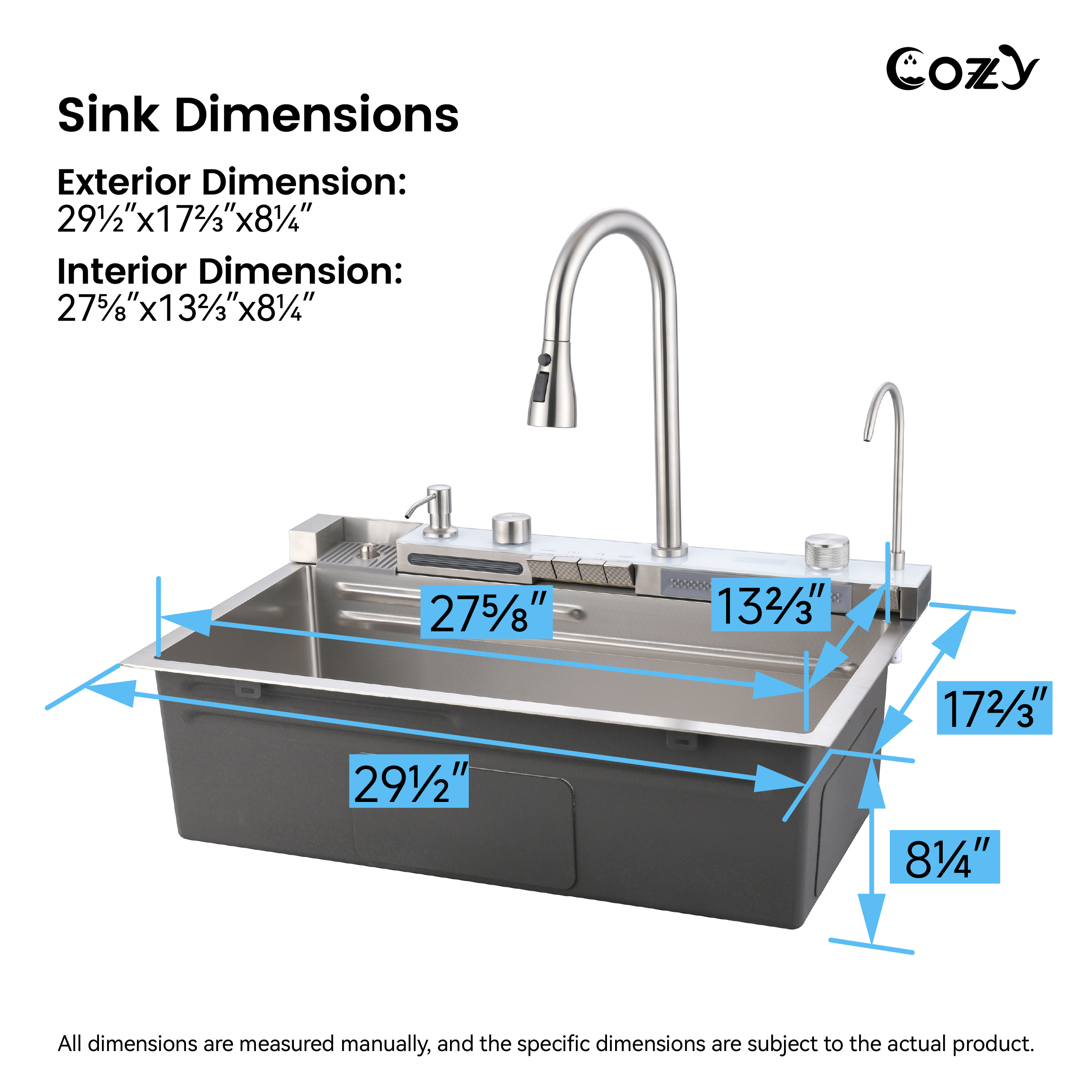 29.5×18″ Stainless Steel Kitchen Sink, Whale Digital Waterfall Sink with Flying Rain Waterfall, Pull-Down Sprayhead Faucet, and Pressurized Cup Washer, SS-BL06-301808