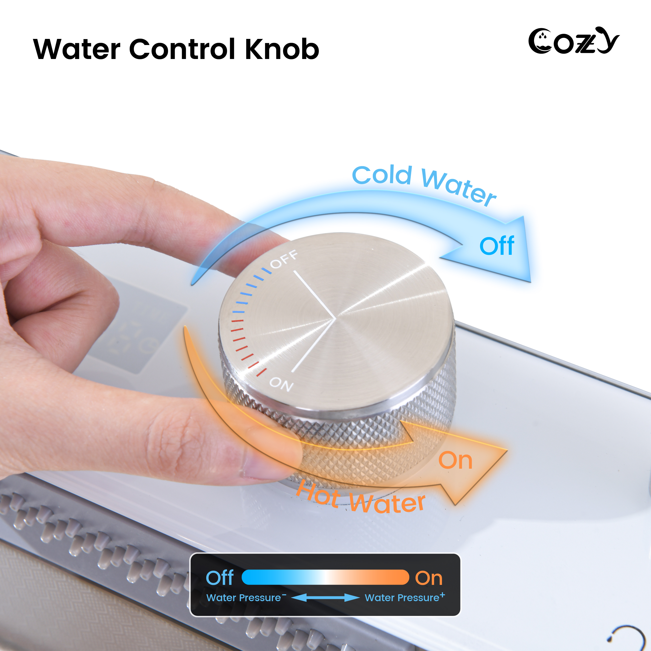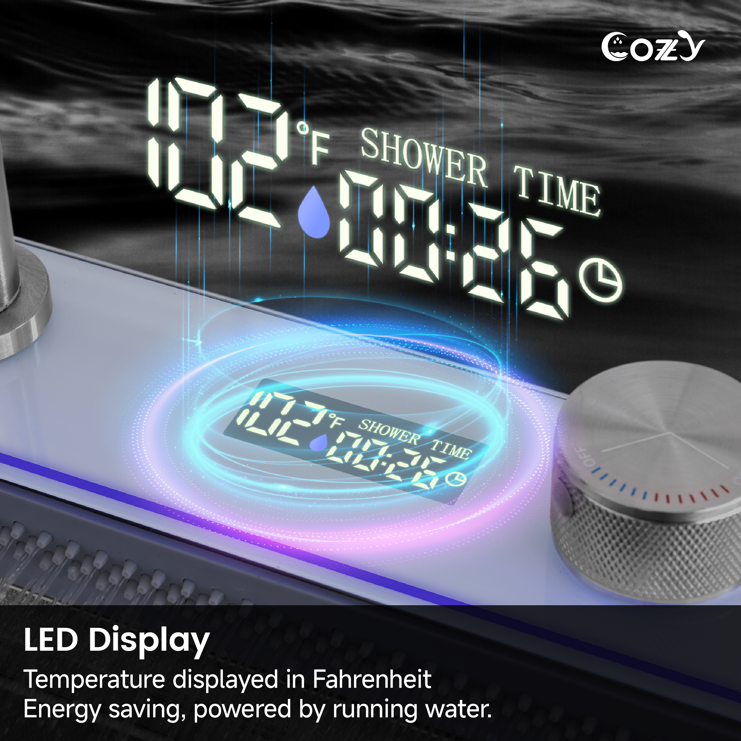 - The digital screen displays the water temperature (℉) and time of use in real time.