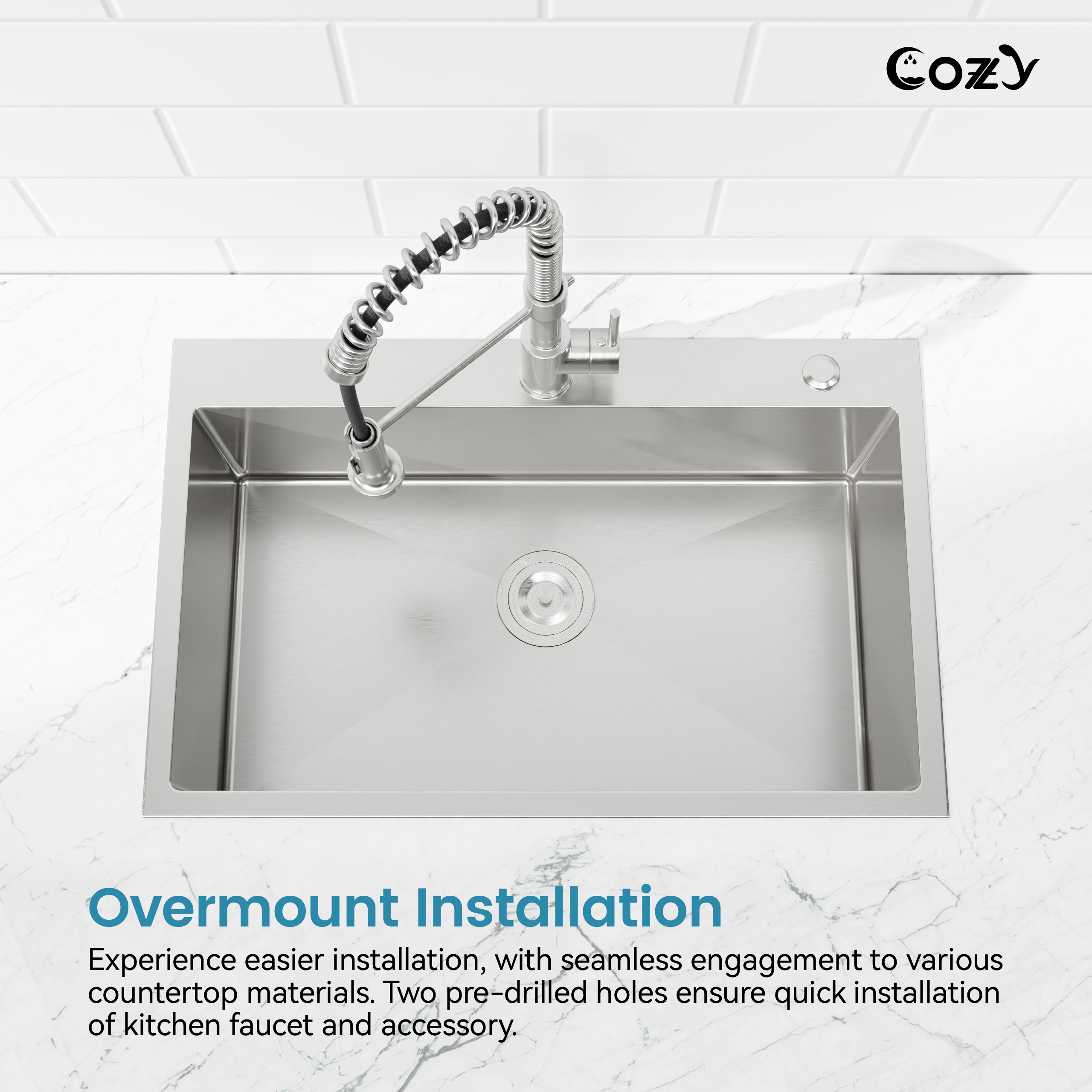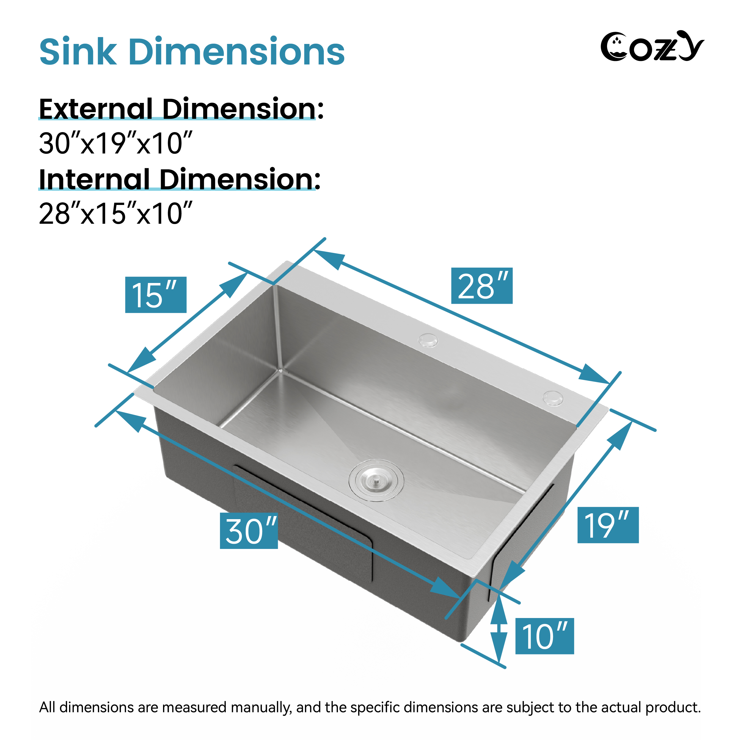 30″x19″ Stainless Steel Kitchen Sink, Single Bowl, Overmount Handmade Sink in Brushed Nickel, with US Standard Drain and Hook,SS-BR02D-301908