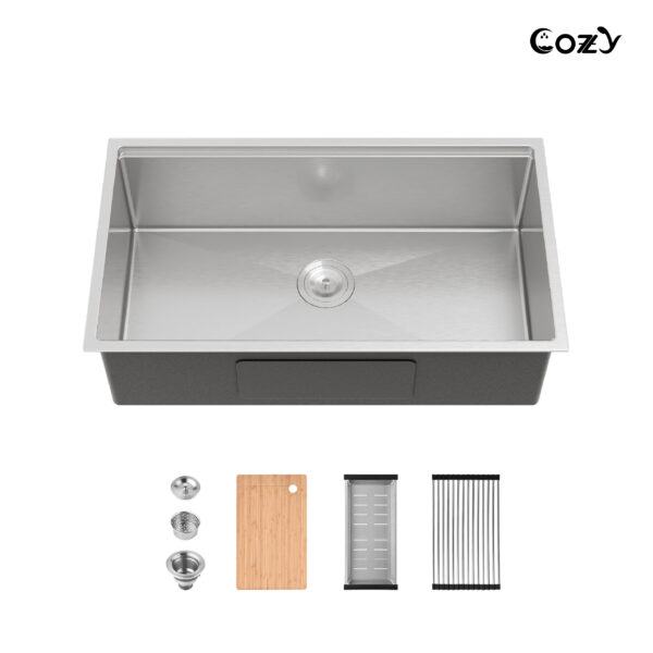 Stainless Steel Kitchen Sink, 30″x22″ Single Bowl, Overmount Handmade Sink in Black, with Cutting Board, Colander, Grid, SS-BL-08