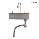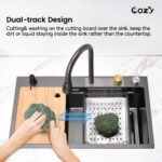 - This sink includes a versatile space for washing, cutting, and draining. The set comes with a cutting board, basin-in-basin, triangular drainage basket, and drainer, maximizing workspace and enhancing functionality.