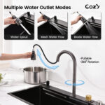 - The pull-out faucet offers three water modes, allowing for focused streams to thoroughly clean fruits and vegetables. The waterfall mode is perfect for rinsing large bowls or food, providing a spacious cleaning area for quick and effective washing.