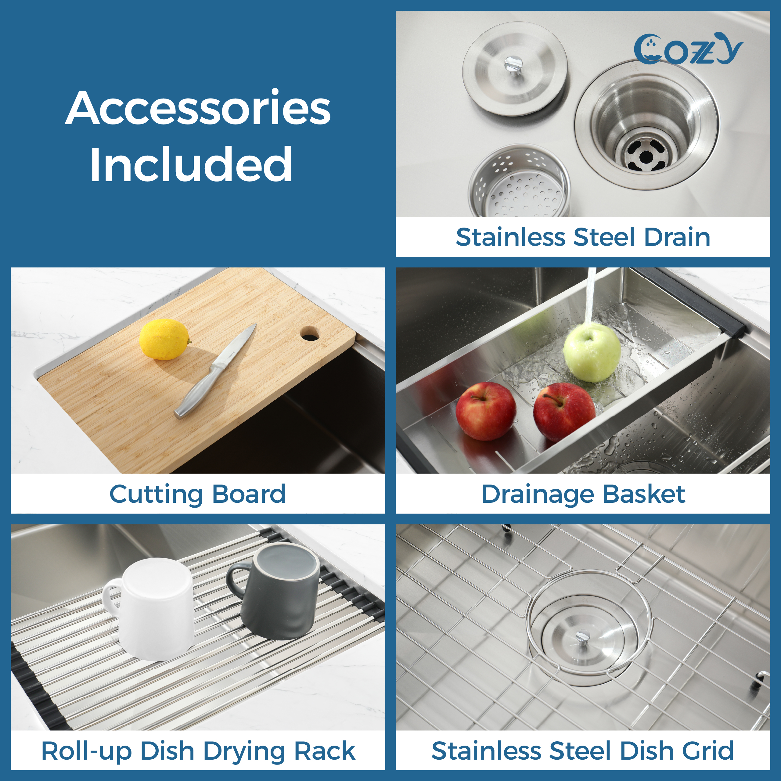 - This multi-functional kitchen sink comes equipped with a cutting board, a roll-out basket, and an integrated grid for added convenience and efficiency. The grid helps protect the sink from scratches and improves drainage while keeping dishes and utensils organized.