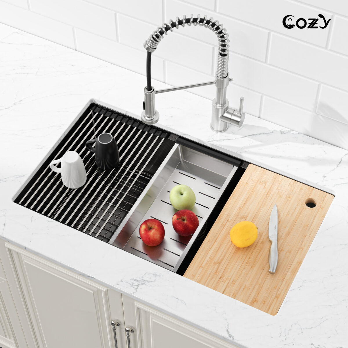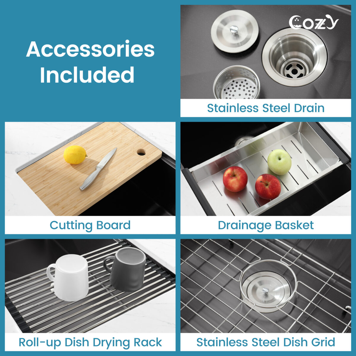- This multi-functional kitchen sink comes equipped with a cutting board, a roll-out basket, and an integrated grid for added convenience and efficiency. The grid helps protect the sink from scratches and improves drainage while keeping dishes and utensils organized.