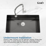 This single bowl kitchen sink is crafted from durable 304 stainless steel, offering exceptional corrosion resistance and a sleek, black steel finish. The scratch-resistant surface ensures easy cleaning and a lasting pristine look. Its spacious design provides ample room for dishwashing and food preparation, making kitchen tasks more efficient. The undermount installation creates a seamless and modern aesthetic, enhancing the overall look of your kitchen.