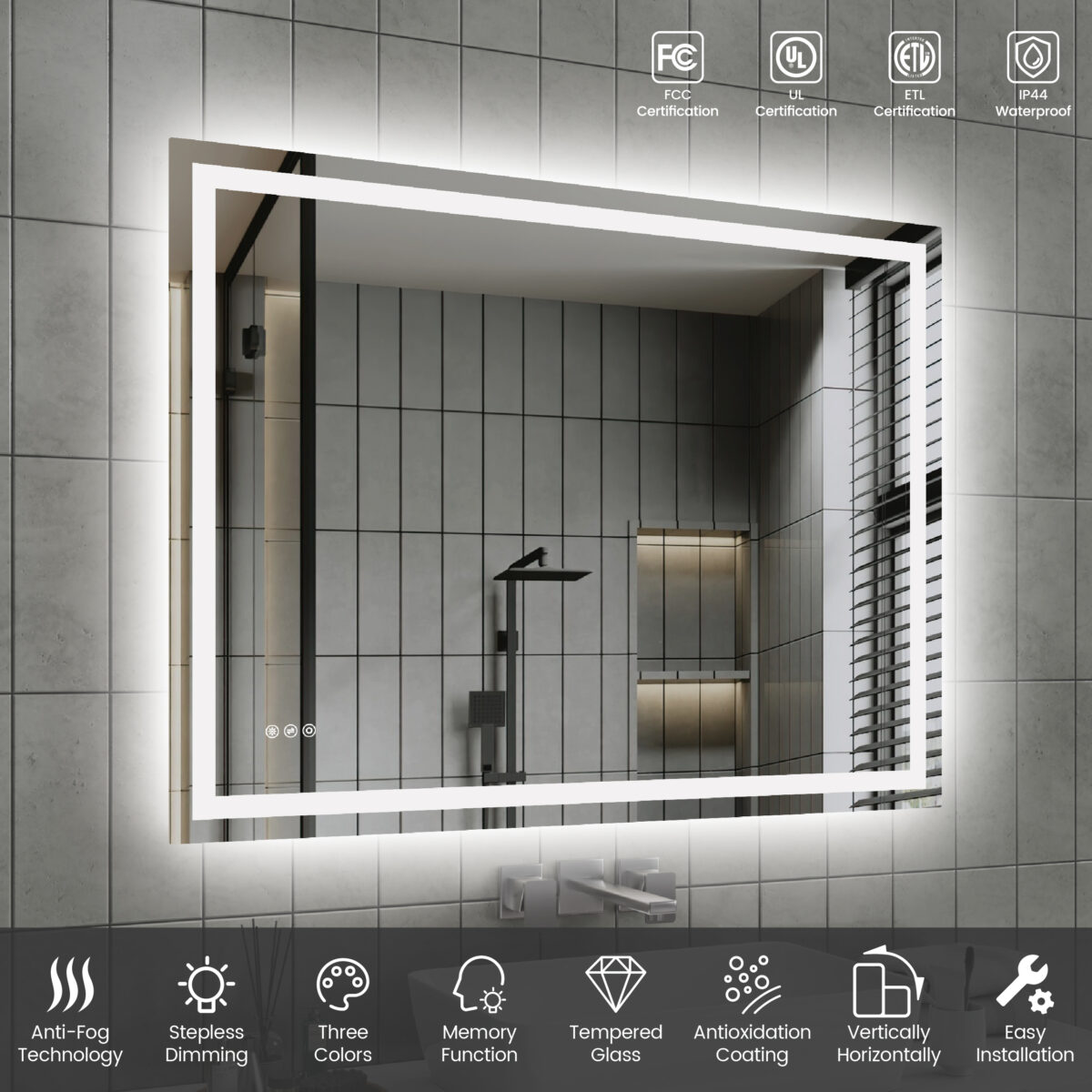 48″x36″ LED Bathroom Mirror, Front-Lit and Back-Lit, Light Srtip Unseen When Turned Off, Color Tem Adjustable, Stepless Dimmable, 3 Colors CRI90+, Brightness Memory, Shatter-Proof,Anti-fog LED Vanity Mirror, Easy Installation,IP44 Waterproof,LM22-FB-4836