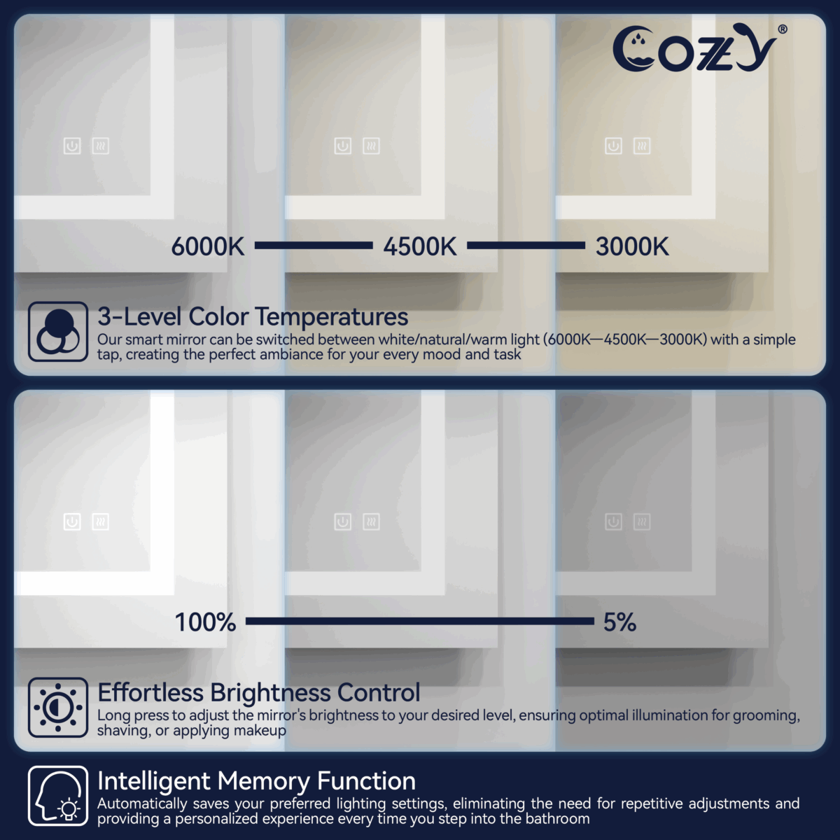- Touch Sensors & Memory: Lighted touch buttons make operation a breeze, and intelligent memory functions will remember your preferred lighting settings, even after turning the mirror off and on.