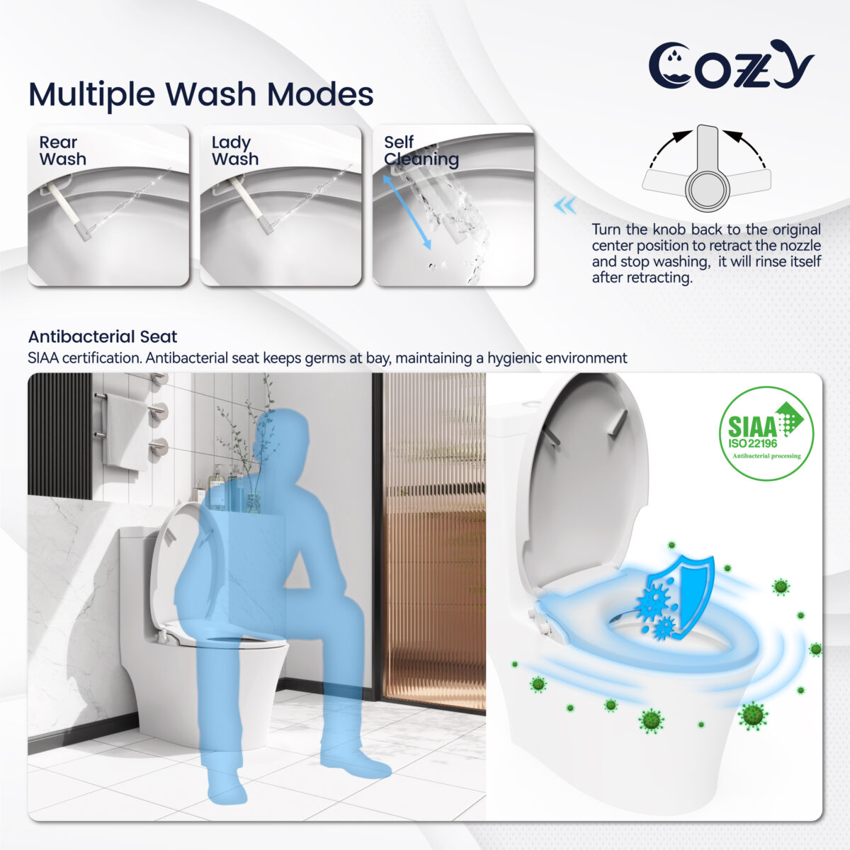 COZY Smart Bidet, Rear & Feminine Wash, Adjustable Water, Seat & Dryer Temp, Antibacterial Seat, Auto Open & Close, Remote Control