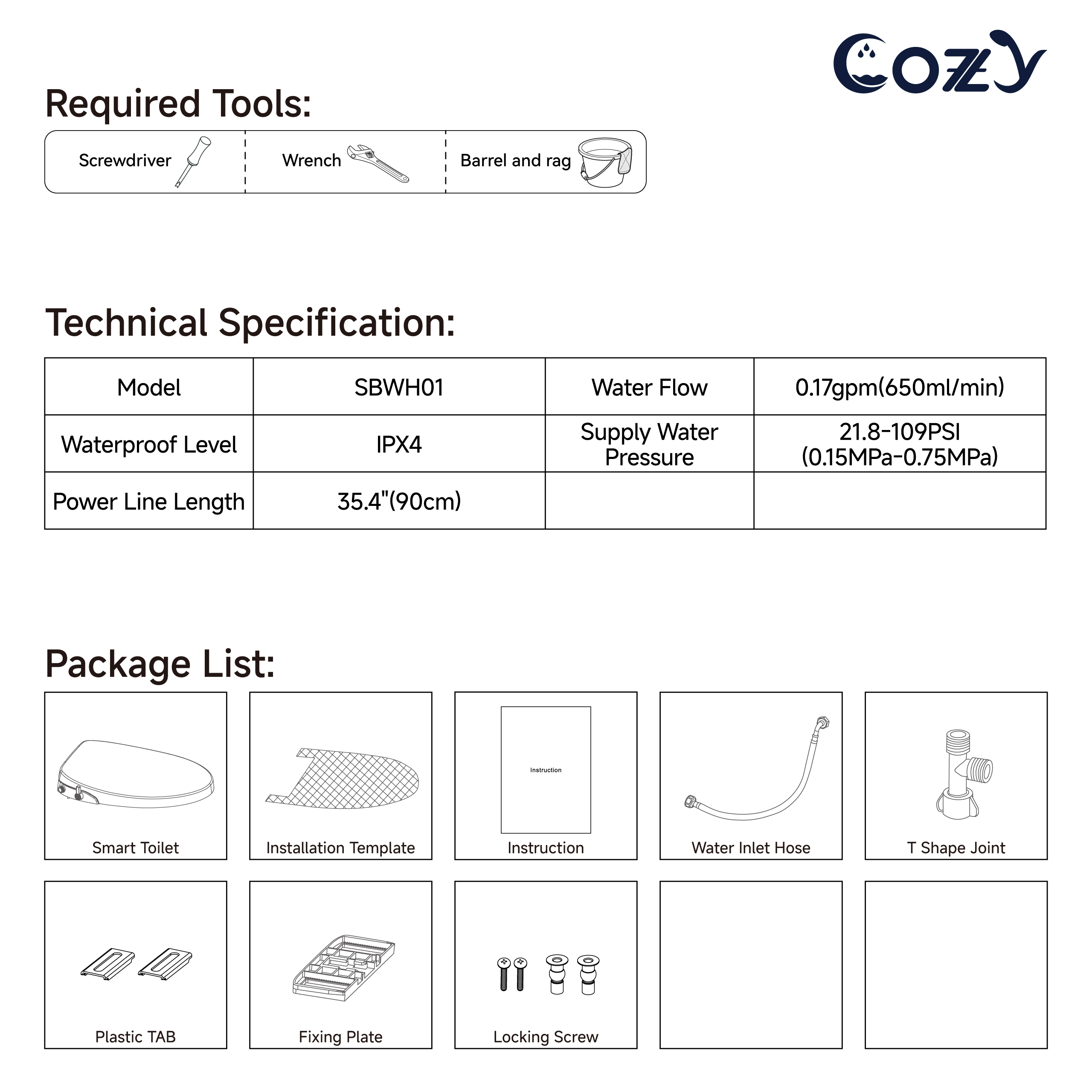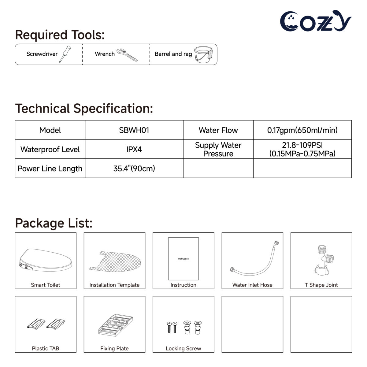 COZY Smart Bidet, Remote Control, Built-In Occupancy Sensor, Heated Seat, Bubble Wash, Warm Water&Drying, Massage, Strong Cleaning, Self-Cleaning Nozzle, LS-SBWH05