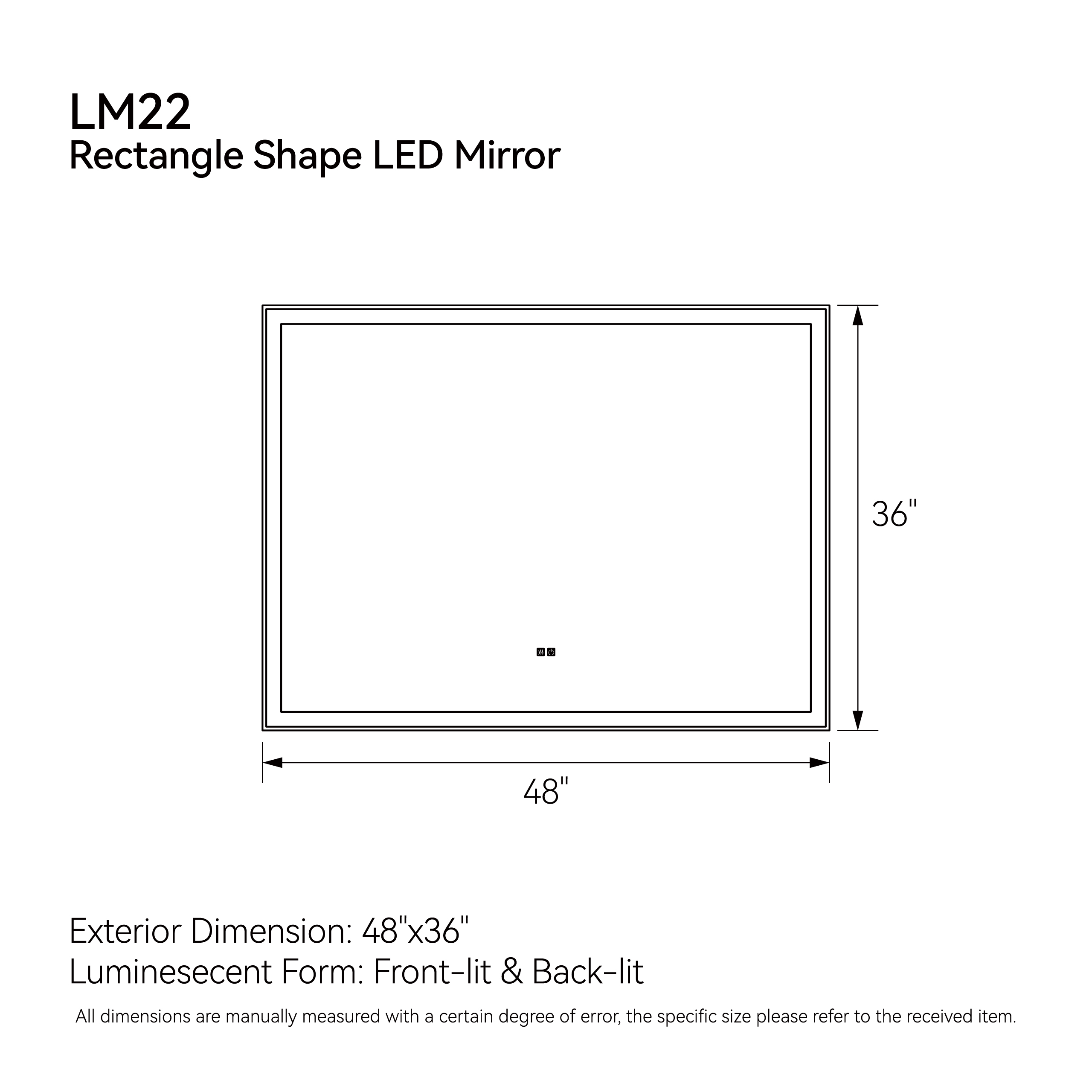 48″x36″ LED Bathroom Mirror, Front-Lit and Back-Lit, Light Srtip Unseen When Turned Off, Color Tem Adjustable, Stepless Dimmable, 3 Colors CRI90+, Brightness Memory, Shatter-Proof,Anti-fog LED Vanity Mirror, Easy Installation,IP44 Waterproof,LM22-FB-4836
