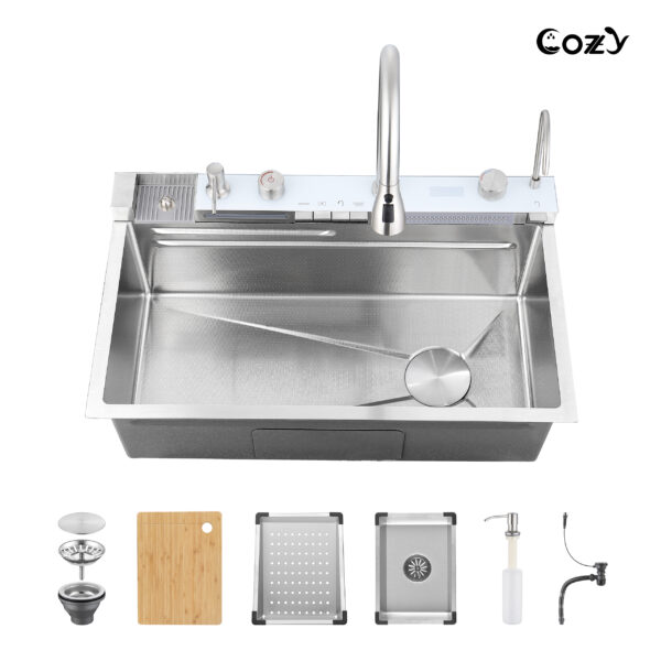29.5×18″ Stainless Steel Kitchen Sink, Whale Digital Waterfall Sink with Flying Rain Waterfall, Pull-Down Sprayhead Faucet, and Pressurized Cup Washer, SS-BL06-301808